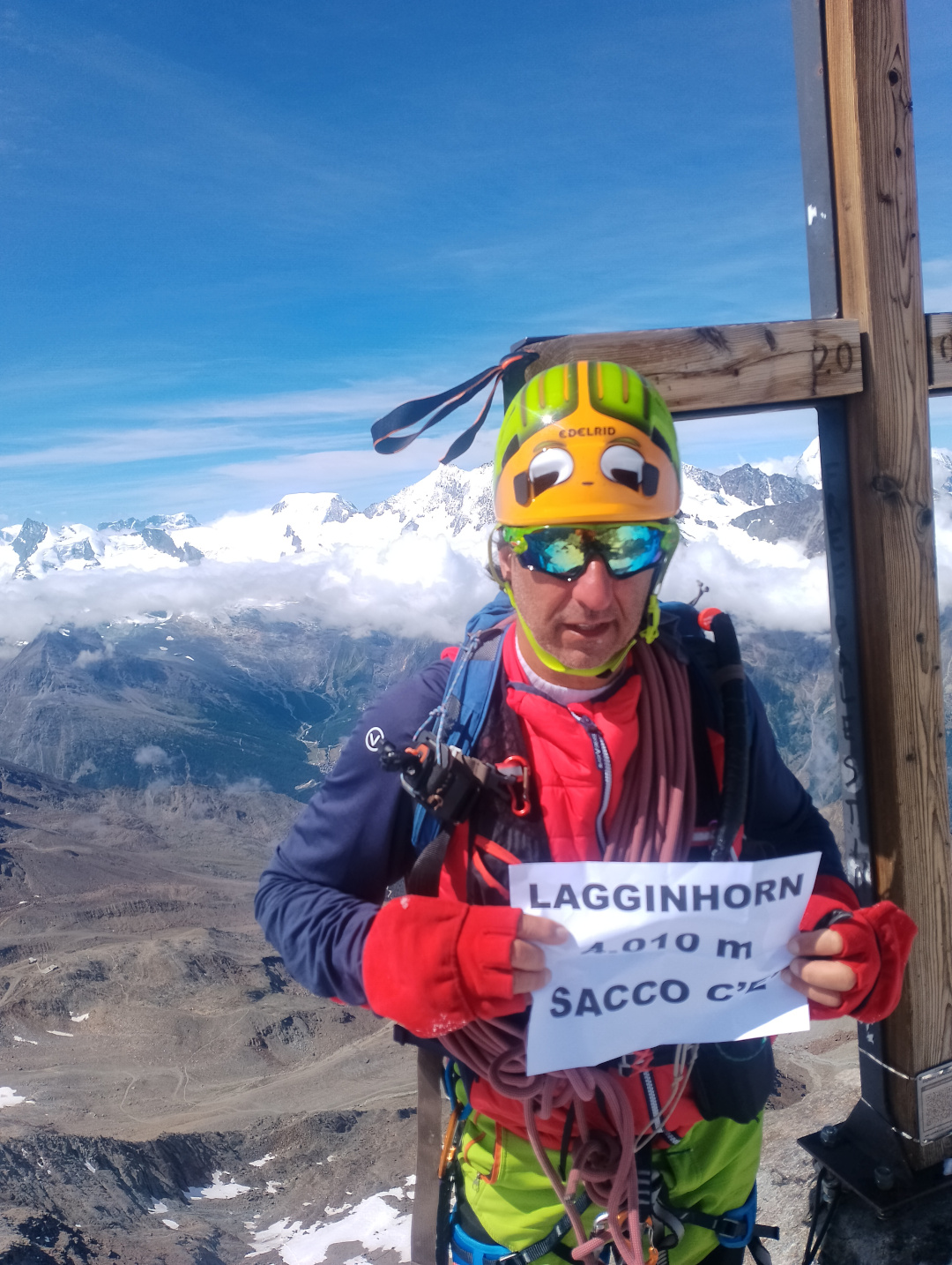 Dalla stazione intermedia di Kreuzboden, si segue l´ampia e frequentata mulattiera che in ca un´ ora conduce alla Weissmieshutte (2726 m), da cui si prosegue sempre su ampia mulattiera per la Hohsaashutte, risalendo la grande morena che fronteggia la Capanna. Una volta al culmine, dove si può giungere più direttamente anche col sentierino descritto nella nota della Cresta Integrale, si piega a destra, evitando di guadare due volte il torrente per una scorciatoia, arrivando ad un bivio dove, abbandonato il segnavia per Hohsaas, ci si tiene a sinistra costeggiando il torrente che scende dal soprastante Hohlaubgletscher dapprima sulla destra, quindi sulla sinistra. Per dossi morenici dopo varie svolte del sentiero che sale a serpentina, si raggiunge l´origine della cresta rocciosa che divide l´Hohlaubgletscher dal Lagginhorngletscher, e restando sulla sinistra per neve e sfasciumi, ci si porta al Lagginhorngletscher, grossomodo punto d´ incontro con l´ itinerario proveniente dalla Hohsaashutte, di cui si rimanda alla nota. Calzati i ramponi, si attraversa verso sinistra l´ intero ghiacciaio che non presenta difficoltà, raggiungendo la cresta W in corrispondenza di un ampio terrazzo, dal quale, seguendo gli ometti, i segni dei ramponi sulle rocce e radi bolli rossi, se ne guadagna il filo (I). Stando leggermente sulla destra, lo si segue per buone rocce arrivando ad una placca rocciosa (II) di una decina di metri, incisa da una bella fessura , seguita da rocce più facili che conducono ad una forcella che precede l´ultima impennata della cresta. Dopo tratti su sfasciumi alternati a buone rocce, aggirato un modesto nevaio sulla destra si riprende il filo percorrendolo senza grosse difficoltà sino al roccioso blocco sommitale che si rimonta sulla destra (II-). Vista grandiosa su un´ impressionante schiera di 4000