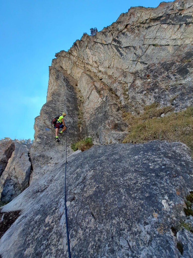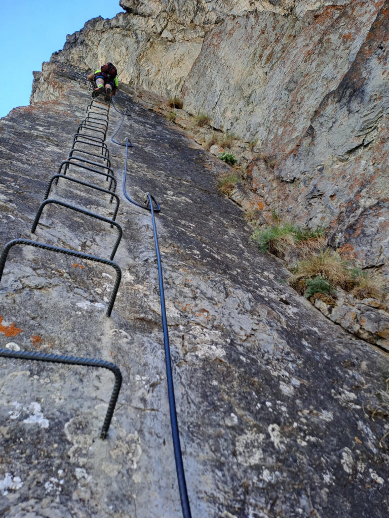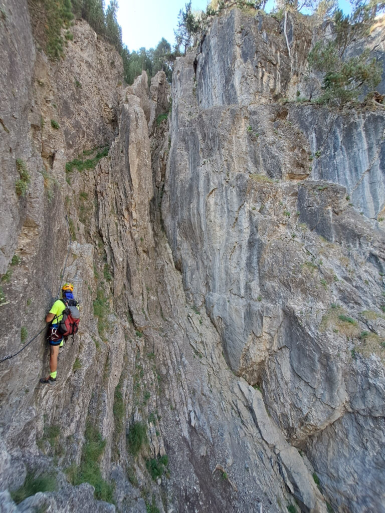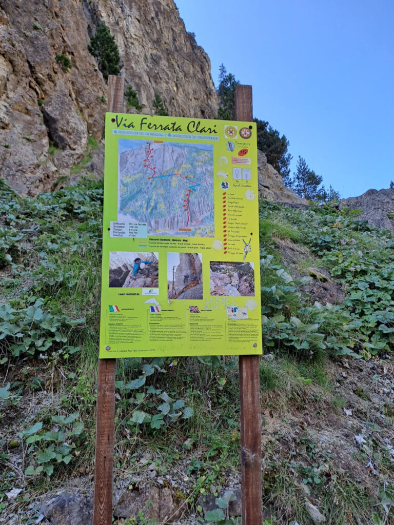 difficoltà complessiva D+, 700 m sviluppo totale, 500 m dislivello, 300 gradini, tempo parcorrenza 3/4 ore.Accanto all’attacco della ferrata sono state aperte alcune vie di arrampicata, tiri doppi o singoli, con spit e soste attrezzate.L’attacco della ferrata si può raggiungere da due zone:(1) lasciando la macchina presso lo spiazzo del tornante della statale Cesana-Claviere, prima della prima nuova galleria paravalanghe, in corrispondenza di cartelloni-insegne-bandiere di sport montani, vicino al fiume; proseguire nelle gorge, superare la falesia di rocca clarì e giungere all’attacco della ferrata sulla sinistra inidicato con evidente cartello.(2) lasciando l’auto all’abitato di Claviere, recarsi presso le seggiovie, portarsi all’arrivo del grande(!) Ponte tibetano in corrispondenza del bunker e scendere nelle Gorge seguendo le passerelle e il fiume, sino a raggiungere l’attacco della ferrata sulla destra indicato con evidente cartello.La via ferrata consta di tre settori:il primo: ripida e divertente salita (saliscendi) sullo spigolo di una lama di calcare raddrizzato-verticale (è tipica la forte tettonizzazione delle rocce calcaree in questa area). Tratto ben attrezzato.il secondo: traverso verso sinistra tramite sentieri, cenge erbose, ghiaioni.il terzo: salita delle rocce terminali di rocca clari. La prima metà presenta una salita piuttosto discontinua, poco attrezzata; la seconda metà, più verticale e con più scalini, segue lo spigolo della placconata portandosi con paesaggi aerei ed esposti a sinistra e a destra del suddetto spigolo. Tratto ben attrezzato.Rientro per sentiero e poi strada passando per località La Coche, sino all’abitato di Claviere. Da qui, chi ha le auto presso il tornante della statale, deve ripercorrere le gorge fino ad esso (intinerario (2) ), ritransitando davanti all’attacco della ferrata.