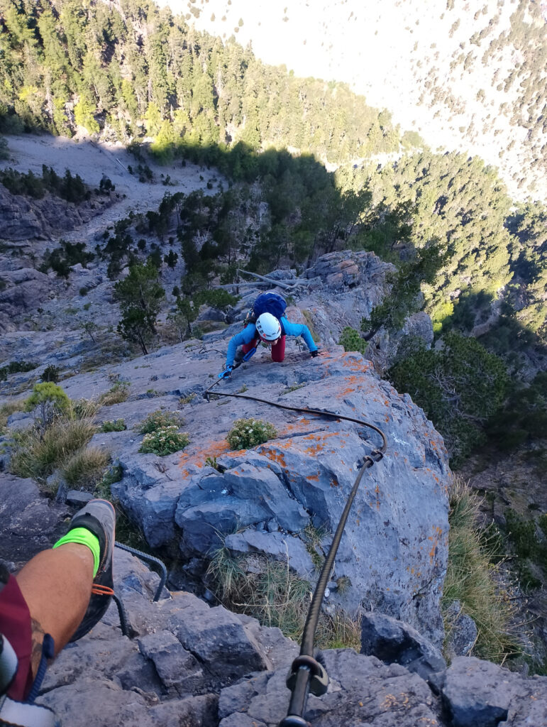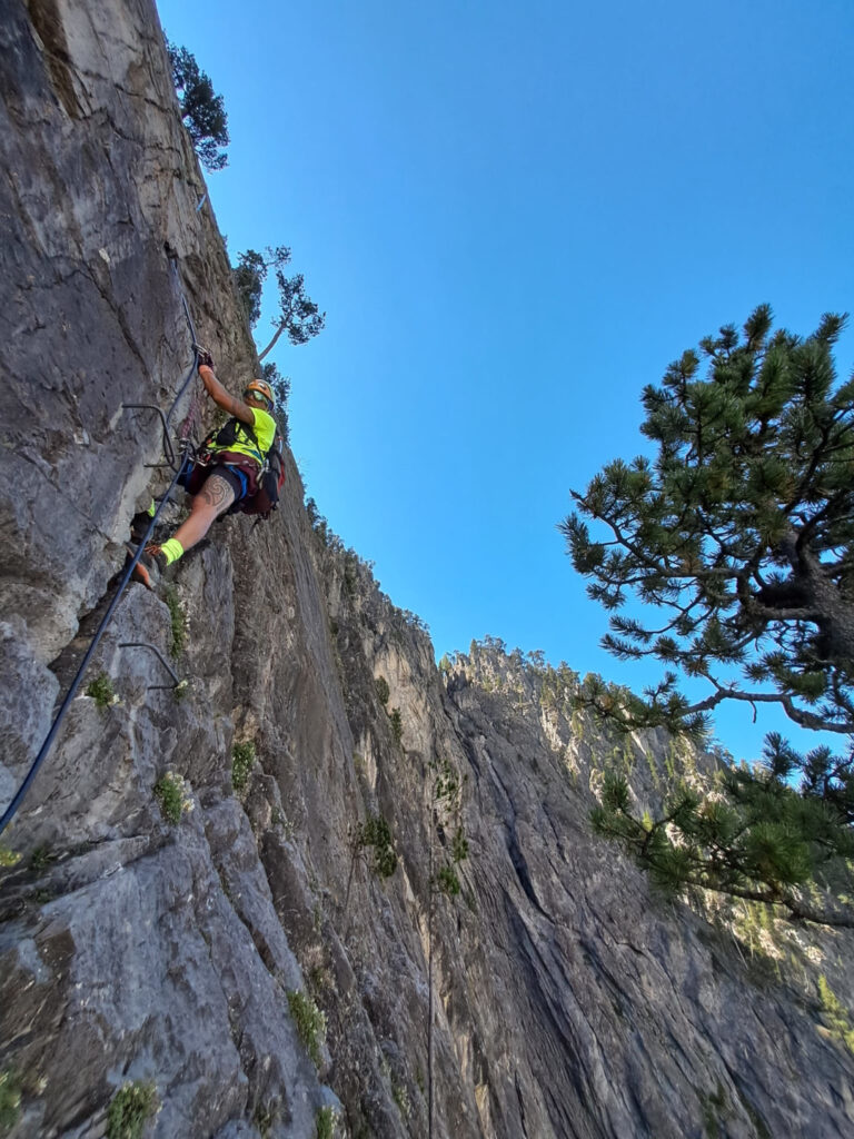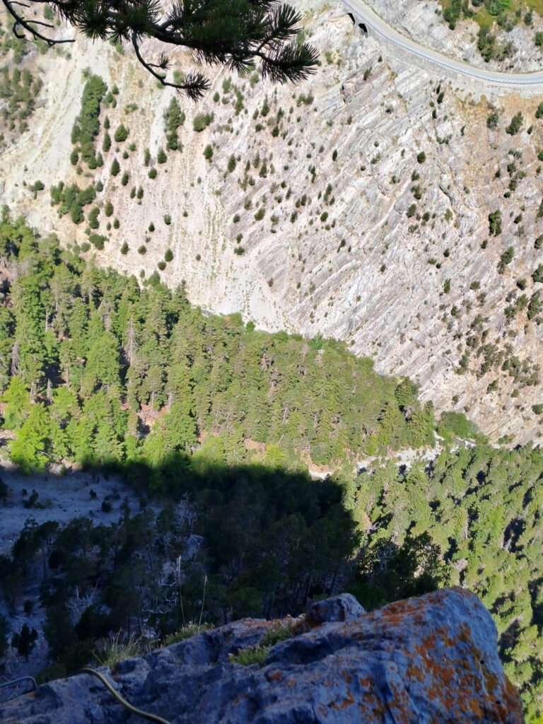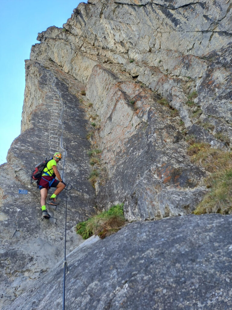 difficoltà complessiva D+, 700 m sviluppo totale, 500 m dislivello, 300 gradini, tempo parcorrenza 3/4 ore.Accanto all’attacco della ferrata sono state aperte alcune vie di arrampicata, tiri doppi o singoli, con spit e soste attrezzate.L’attacco della ferrata si può raggiungere da due zone:(1) lasciando la macchina presso lo spiazzo del tornante della statale Cesana-Claviere, prima della prima nuova galleria paravalanghe, in corrispondenza di cartelloni-insegne-bandiere di sport montani, vicino al fiume; proseguire nelle gorge, superare la falesia di rocca clarì e giungere all’attacco della ferrata sulla sinistra inidicato con evidente cartello.(2) lasciando l’auto all’abitato di Claviere, recarsi presso le seggiovie, portarsi all’arrivo del grande(!) Ponte tibetano in corrispondenza del bunker e scendere nelle Gorge seguendo le passerelle e il fiume, sino a raggiungere l’attacco della ferrata sulla destra indicato con evidente cartello.La via ferrata consta di tre settori:il primo: ripida e divertente salita (saliscendi) sullo spigolo di una lama di calcare raddrizzato-verticale (è tipica la forte tettonizzazione delle rocce calcaree in questa area). Tratto ben attrezzato.il secondo: traverso verso sinistra tramite sentieri, cenge erbose, ghiaioni.il terzo: salita delle rocce terminali di rocca clari. La prima metà presenta una salita piuttosto discontinua, poco attrezzata; la seconda metà, più verticale e con più scalini, segue lo spigolo della placconata portandosi con paesaggi aerei ed esposti a sinistra e a destra del suddetto spigolo. Tratto ben attrezzato.Rientro per sentiero e poi strada passando per località La Coche, sino all’abitato di Claviere. Da qui, chi ha le auto presso il tornante della statale, deve ripercorrere le gorge fino ad esso (intinerario (2) ), ritransitando davanti all’attacco della ferrata.