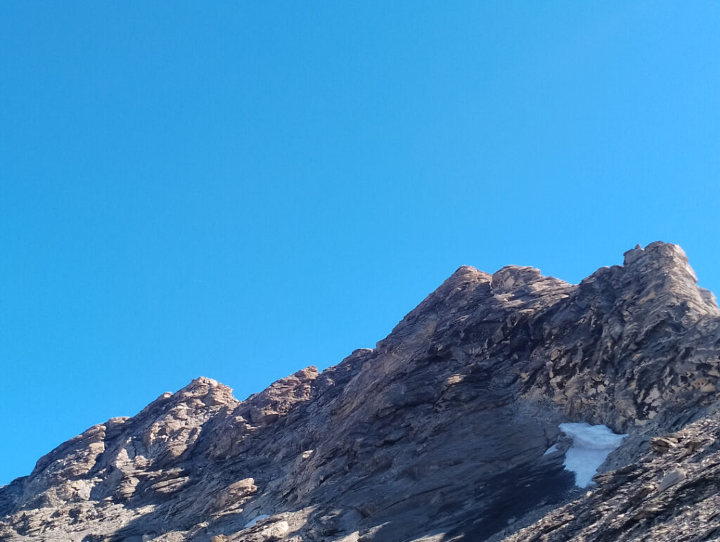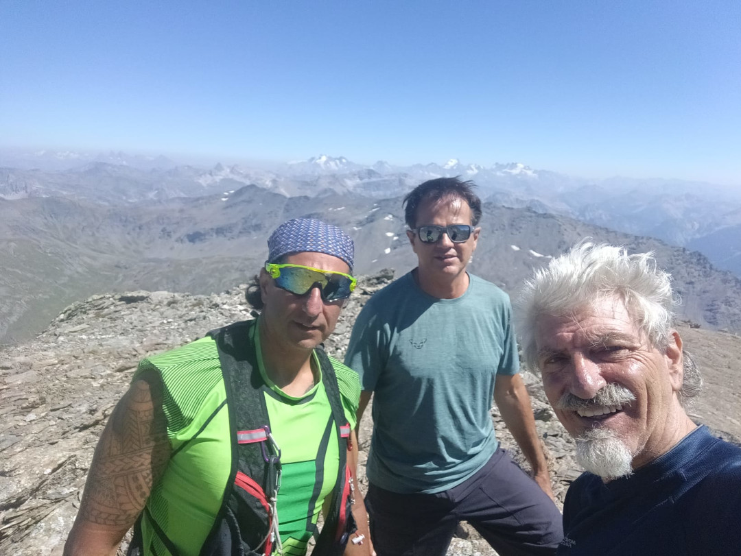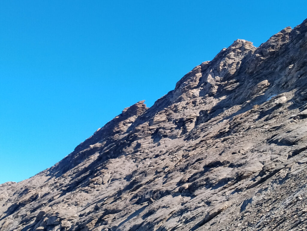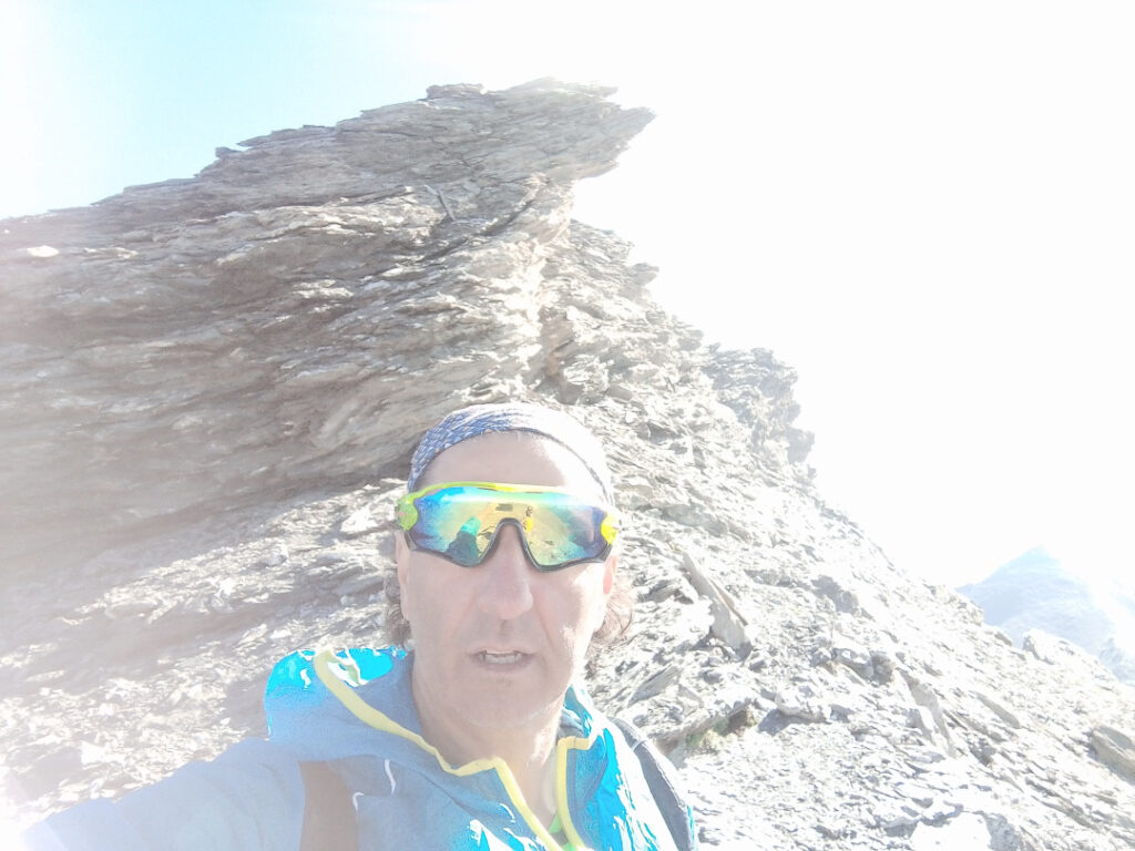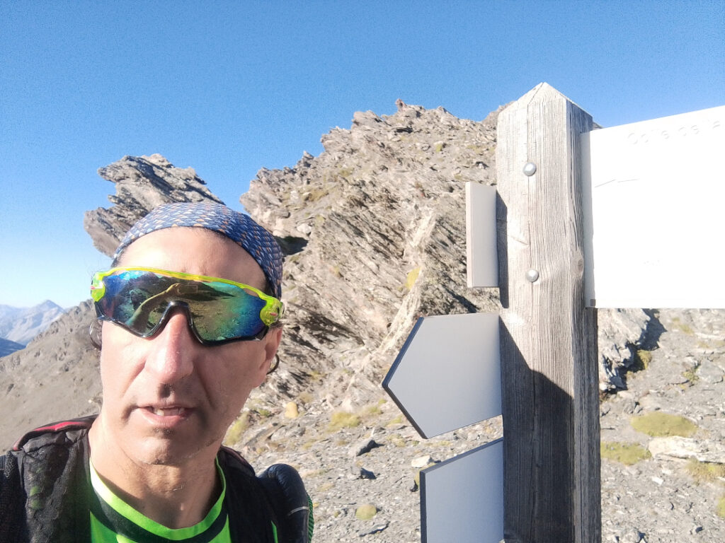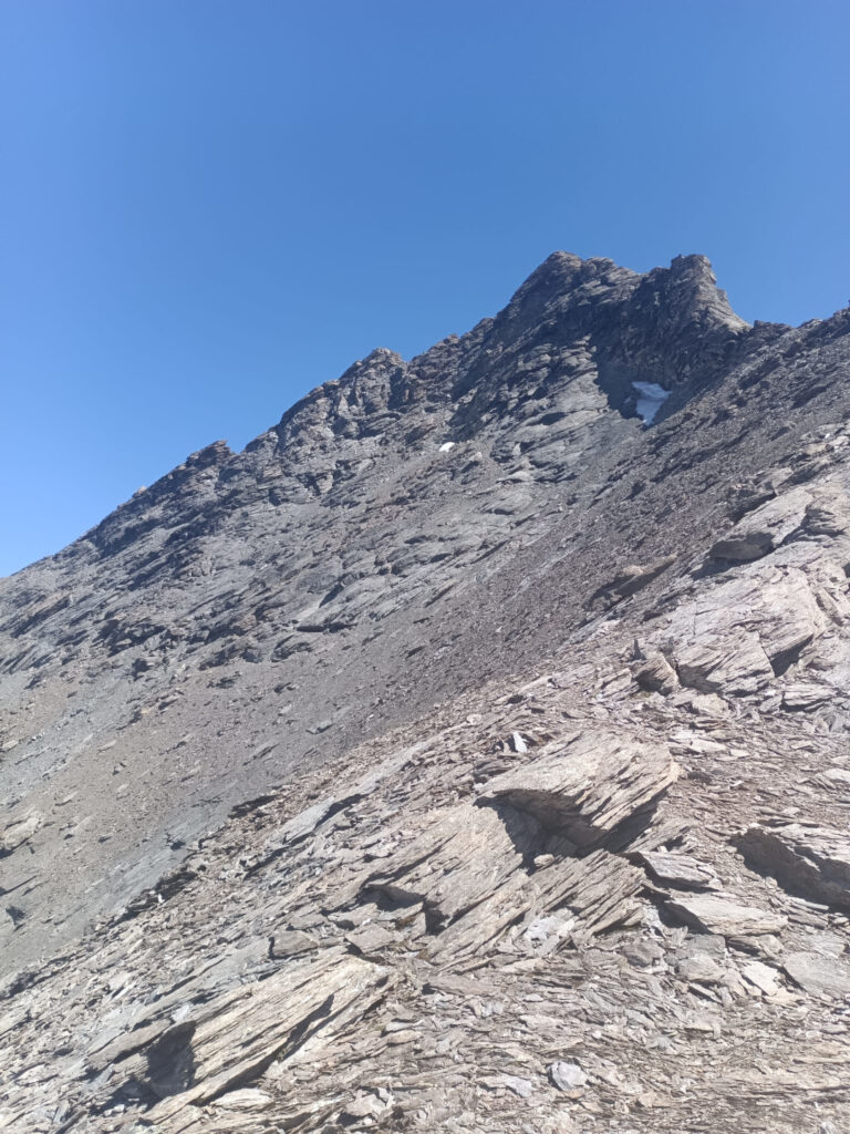 Raggiunto il colle, proseguire a destra percorrendo la lunga cresta SE: il sentiero è ben marcato e segnalato da ometti di pietra. Alla quota di circa 3250 – 3300 m si deve lasciare la cresta SO per raggiungere la cresta NO, attraversando l’immensa pietraia che scende lungo il versante ovest. Purtroppo la traccia per l’attraversamento è quasi invisibile a causa della forte instabilità della pietraia, che cancella rapidamente i segni di passaggio umano. Non fatevi tentare da una traccia segnalata da ometti a quota decisamente inferiore (a causa della nebbia l’abbiamo imboccata per errore): quella giusta comincia in un punto a non più di una quarantina di metri di dislivello dall’evidente parete giallastra che sbarra l’accesso alla vetta lungo la cresta SO.Raggiunta la cresta NO, salire per poche decine di metri e quindi prendere a destra sul versante Ovest, lungo una traccia abbastanza evidente con ometti, che sale obliquamente aggirando i vari costoni di roccia.Proseguire in questo modo fino ad incontrare uno stretto canalone attrezzato con un vecchio chiodo, due soste a fix e una vecchia corda. Risalire il canalone per circa 20 m e proseguire fino a guadagnare nuovamente la cresta NO. Oltepassata la cresta, una cengia obliqua sul versante nord conduce in 15 minuti alla vetta