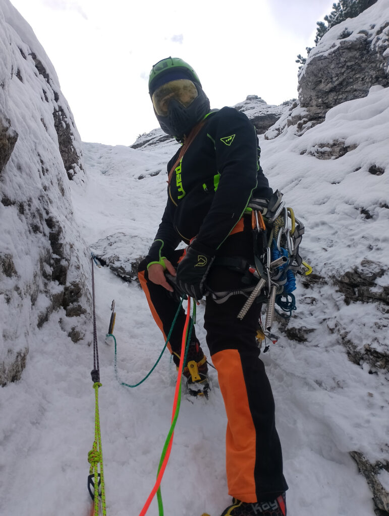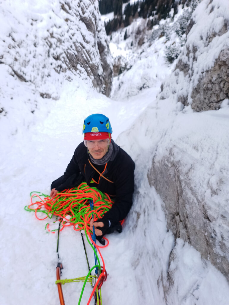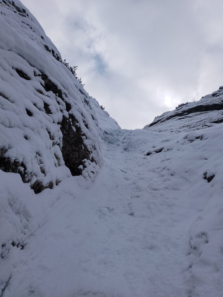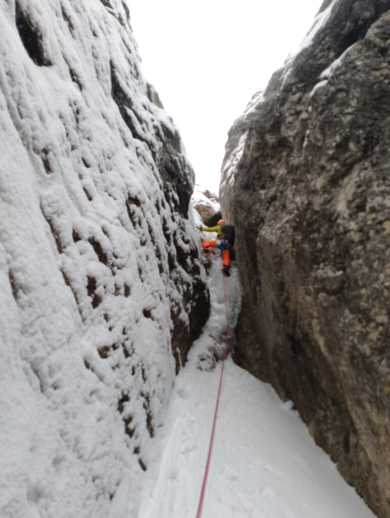 La salita è obbligata nella goulotte, si tratta di sei lunghezze da 60mt, si incontra neve pressata, alcuni bei salti di ghiaccio duro e qualche passetto di misto non difficile.