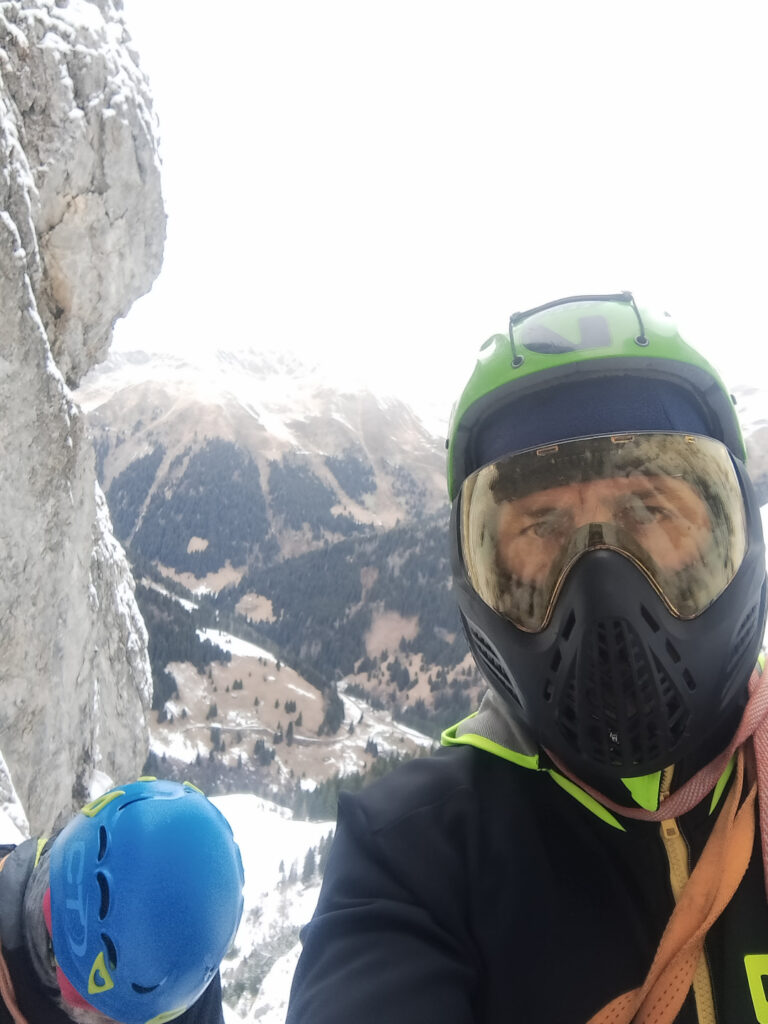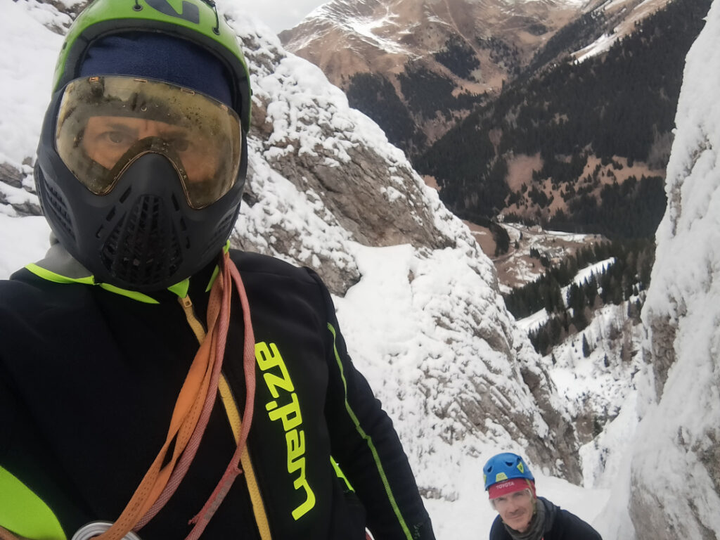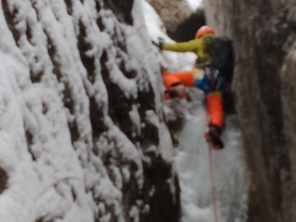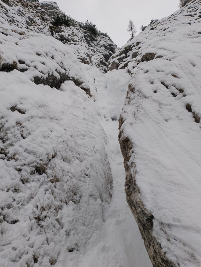 La salita è obbligata nella goulotte, si tratta di sei lunghezze da 60mt, si incontra neve pressata, alcuni bei salti di ghiaccio duro e qualche passetto di misto non difficile.